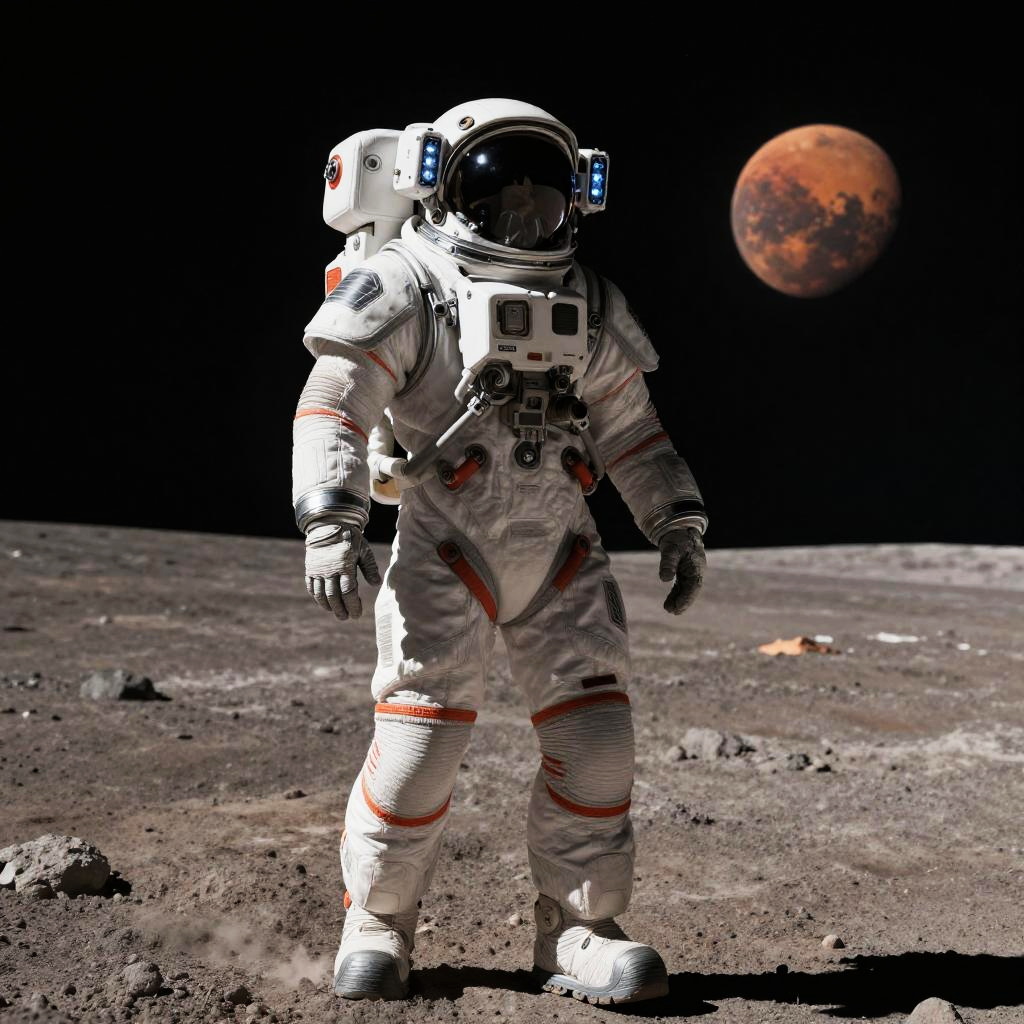 Dynamic scene of a futuristic space suit equipped with jet thrusters, energy shields, and intricate mechanical details, walking on a barren moon surface with Mars visible in the sky