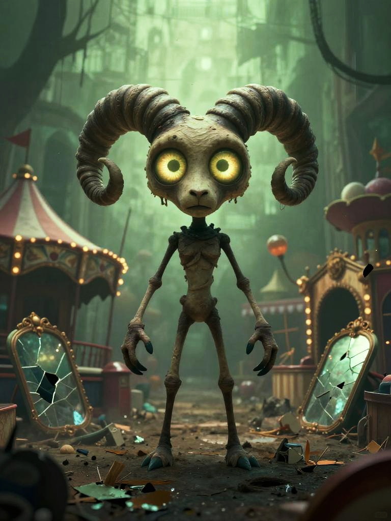Spooky stylized ram character standing upright in the center of a ruined carnival, huge glowing eyes staring at the viewer, long skinny limbs, surrounded by derelict funhouse with cracked mirrors with broken attractions and debris, fine soot drifting slowly filling the air, cinematic wide-angle shot, dark whimsical fantasy style, highly detailed 3d illustration, soft volumetric sickly green backlight light, high resolution