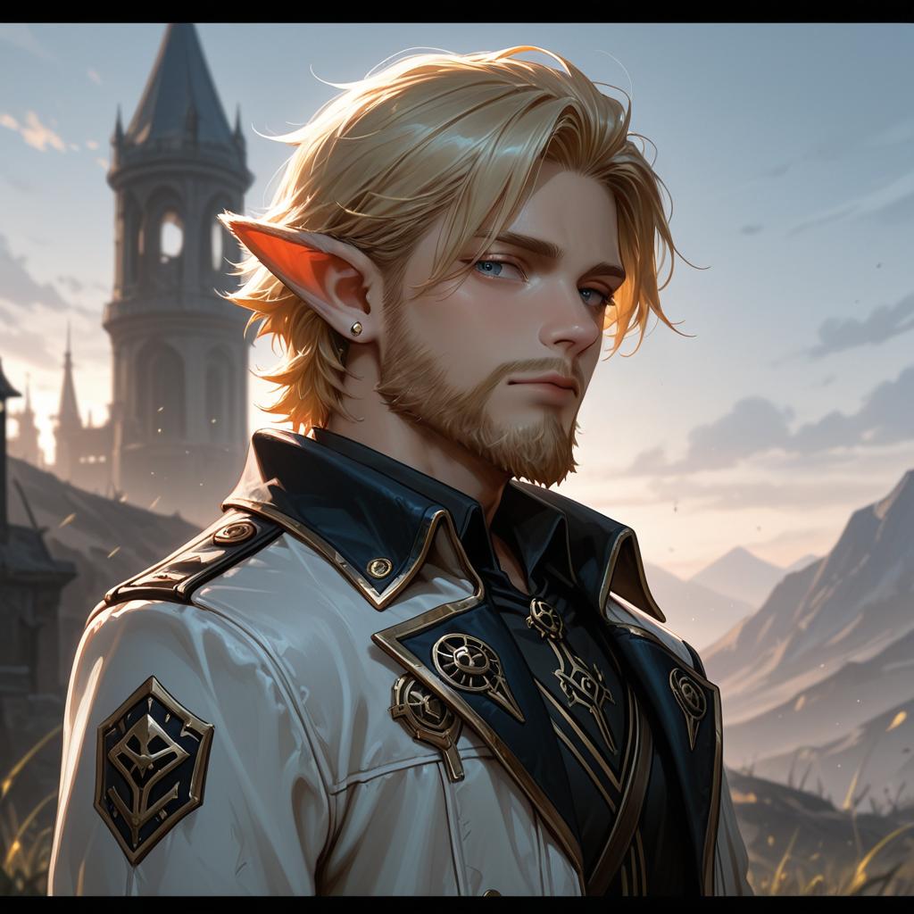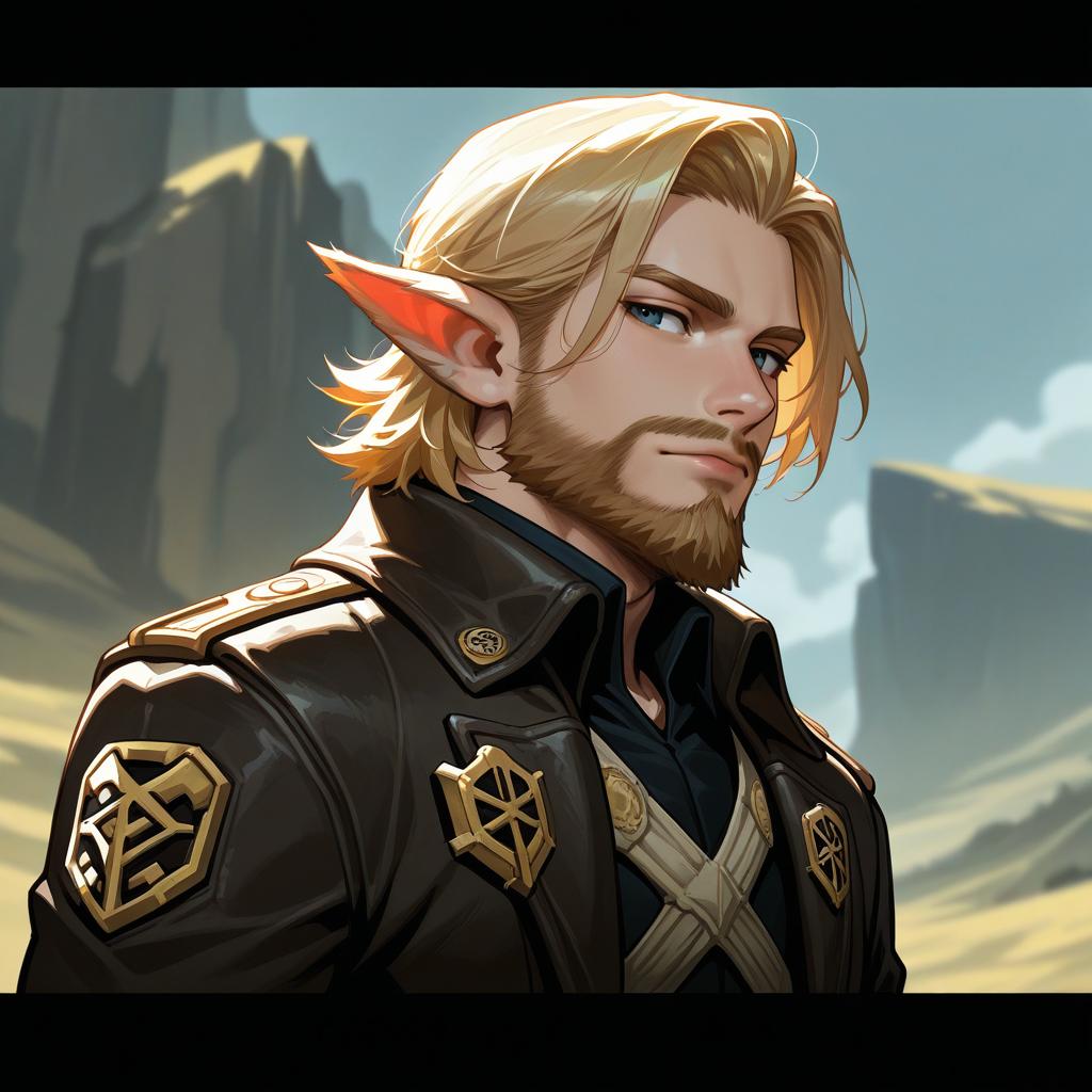 Arcane style, solo, letterboxed, 1boy, yordle, pointy ears, male focus, blonde hair, blue eyes, beard, facial hair, upper body, outdoors, uniform, jacket