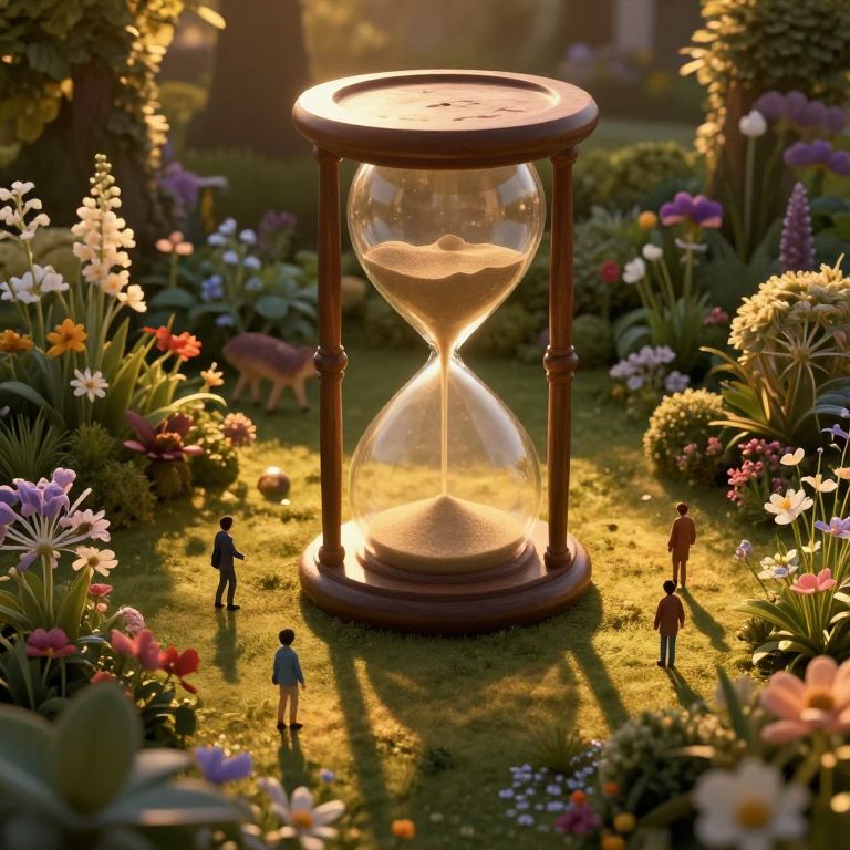 A surreal digital artwork captures a serene garden bathed in warm golden light at twilight, where a whimsical giant hourglass looms large, casting elongated shadows across delicate flowers. From an elevated bird's-eye perspective, observe the juxtaposition of miniature humans wandering amongst the oversized flora and fauna, their quaint lives playing out beneath the colossal timekeeper, evoking both wonder and introspection in viewers as they ponder the fleeting nature of existence. This piece combines enigmatic landscapes with ethereal beauty, creating a dreamlike scene that blurs the line between reality and fantasy, inviting the audience to delve into its enchanting world.