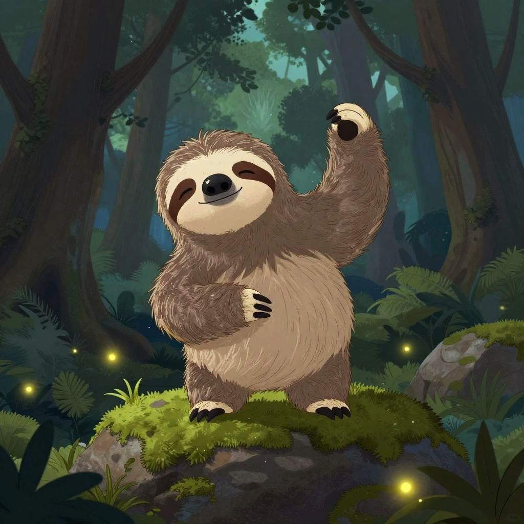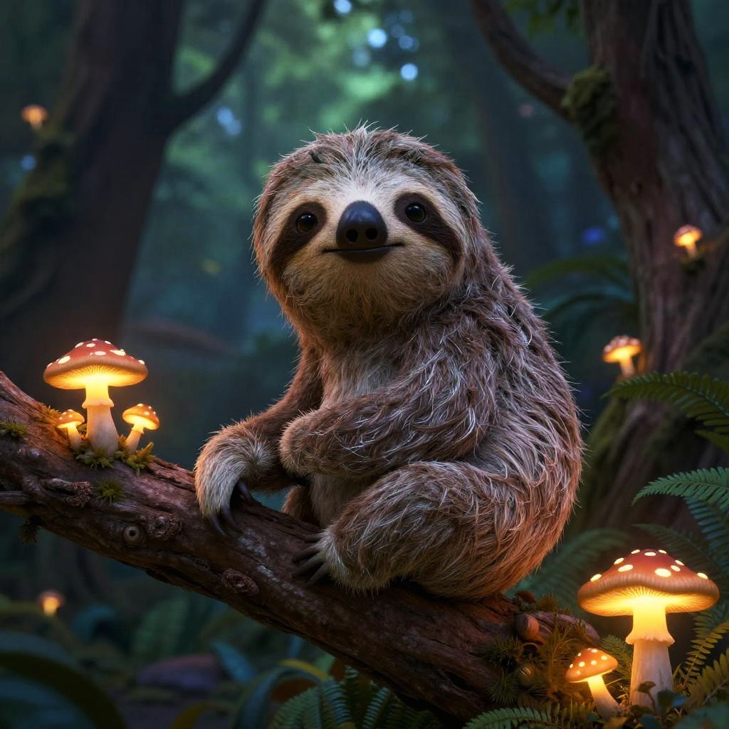 Sid the sloth depicted as a friendly forest guardian, perched on a twisted tree branch with glowing mushrooms around, his fur blending harmoniously with the mystical twilight ambiance, captured in a lush fantasy environment.
