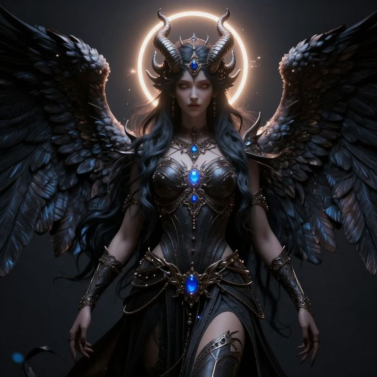 The image depicts an epic, full-body figure of a faceless nephalem, adorned in intricate jewelry and demon horns, set against a dark, ethereal background. The figure is surrounded by a glowing halo and eyes, adding to the divine atmosphere. The figure's long hair flows freely, complementing the detailed, ultra-realistic 4 angel wings that span across the image. The character is dressed in a complex, ornate outfit, featuring a central blue gemstone that stands out amidst the dark, glowing elements. The overall composition is cinematic, with dramatic lighting and high dynamic range (HDR) effects, creating a sense of depth and realism. The octane render enhances the detailed textures and lighting, making the scene appear almost three-dimensional. The dark colors and glowing halo and eyes contribute to the ethereal and divine ambiance, making the figure appear otherworldly and majestic.