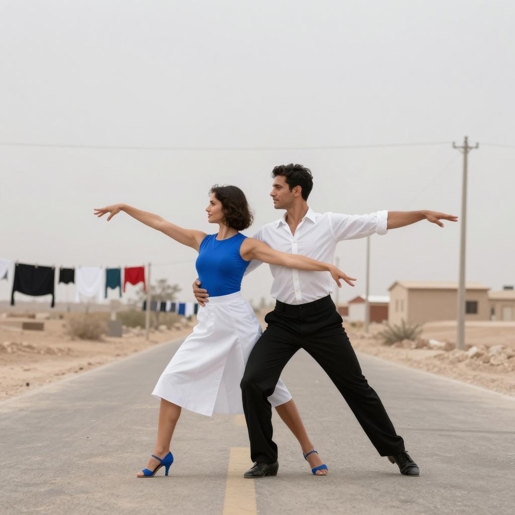 Two men dancing in a shopping mall, arms wide, legs apart. Bald man in gray suit, red sweater; man with curly hair in green jacket, blue pajamas. Background: shoppers, statues, vibrant colors. Bright lights, large windows. People watching, children standing.