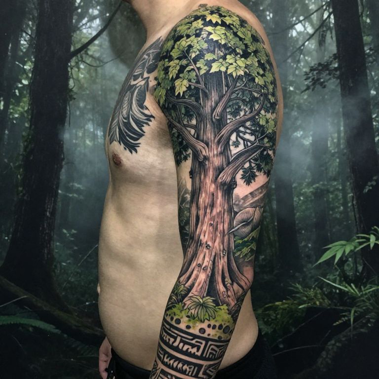 Full sleeve tree tattoo showcasing a towering ancient tree with sprawling canopy and knotted branches, surrounded by a misty forest atmosphere, intricate fine line work combined with shaded leaves and moss, natural elements infused with tribal patterns along the arm.