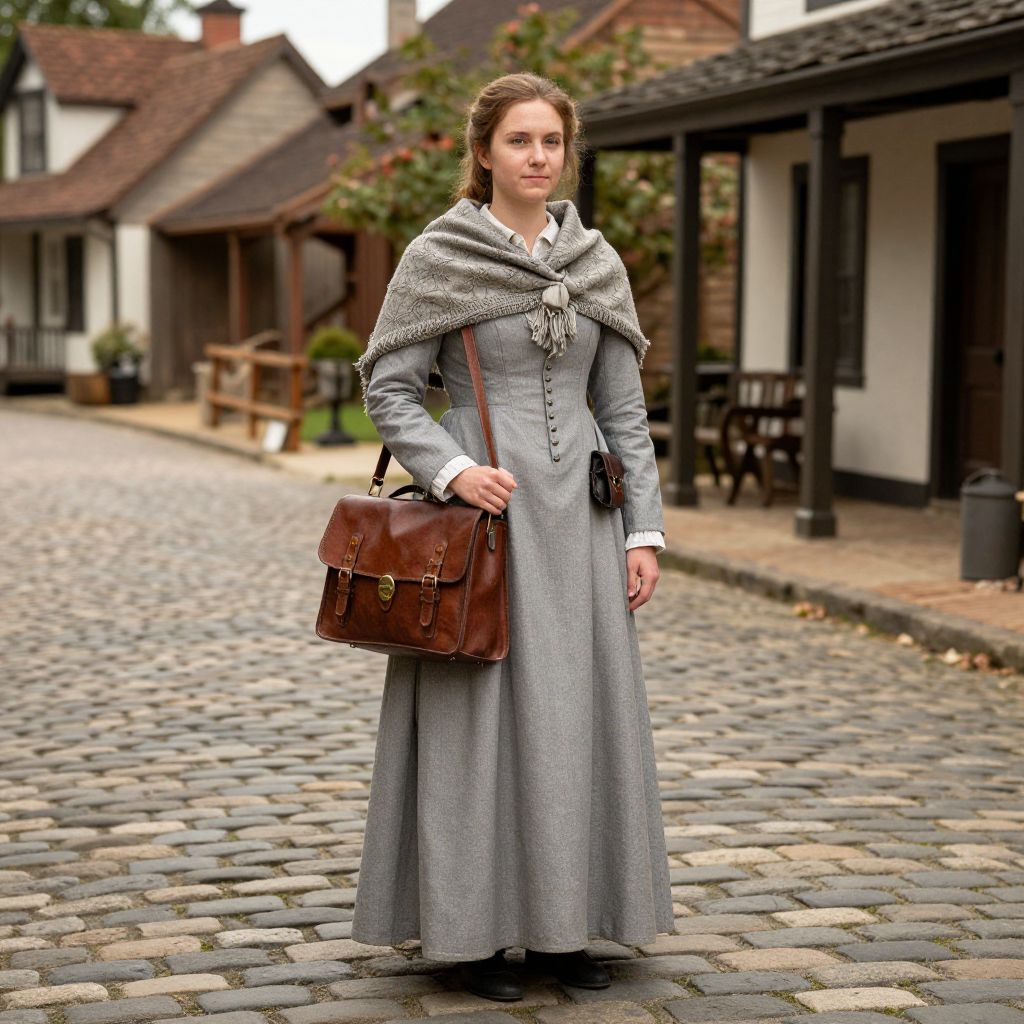 Photograph of a young Caucasian woman in a gray, long, Victorian-style dress with a shawl, brown leather satchel, standing on a