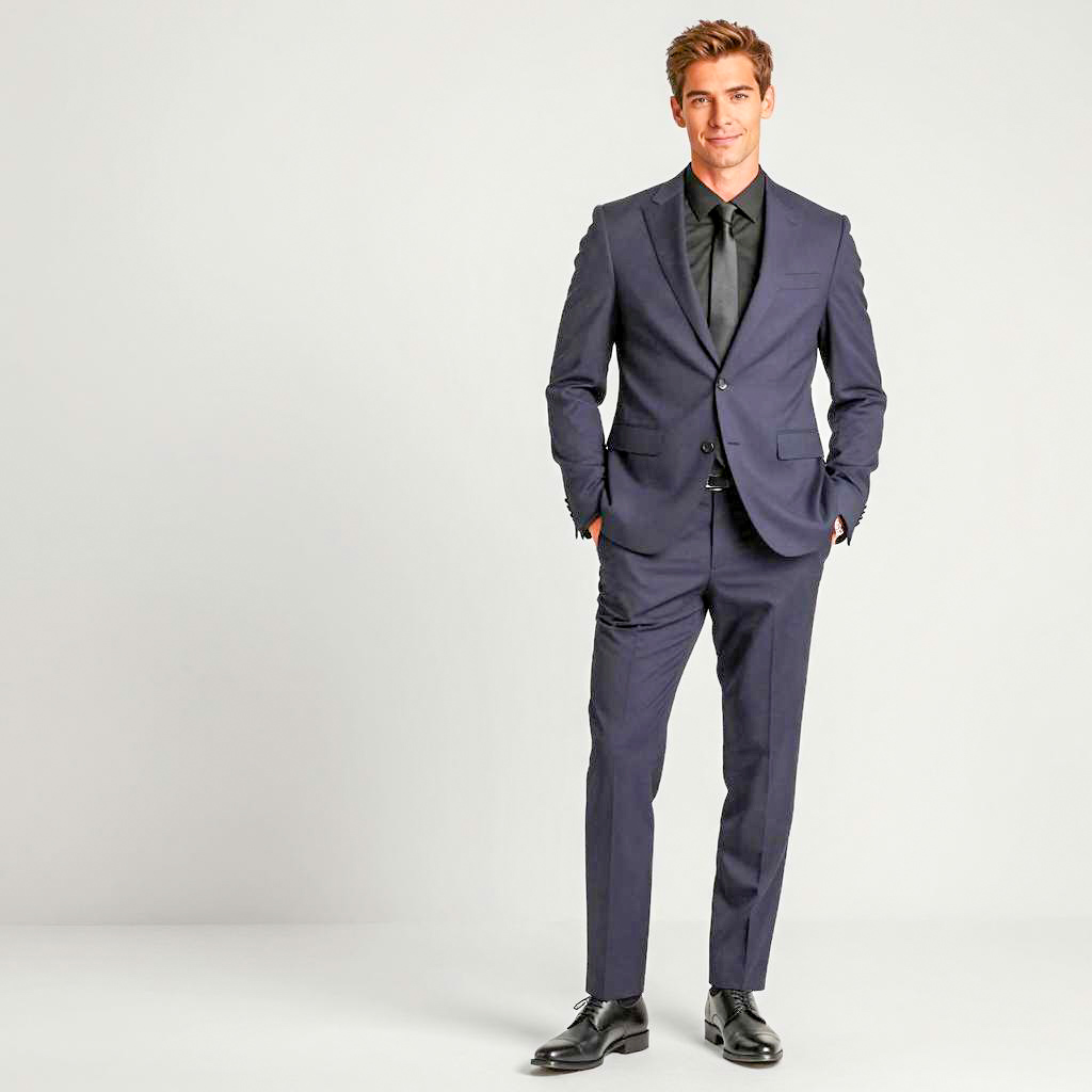 Two people standing back-to-back. Man in black suit with white shirt, black tie, black pants, and black shoes. Woman with long brown hair in pink tank top, black mini skirt, and black knee-high boots. Both looking over their shoulders, smiling. White background.