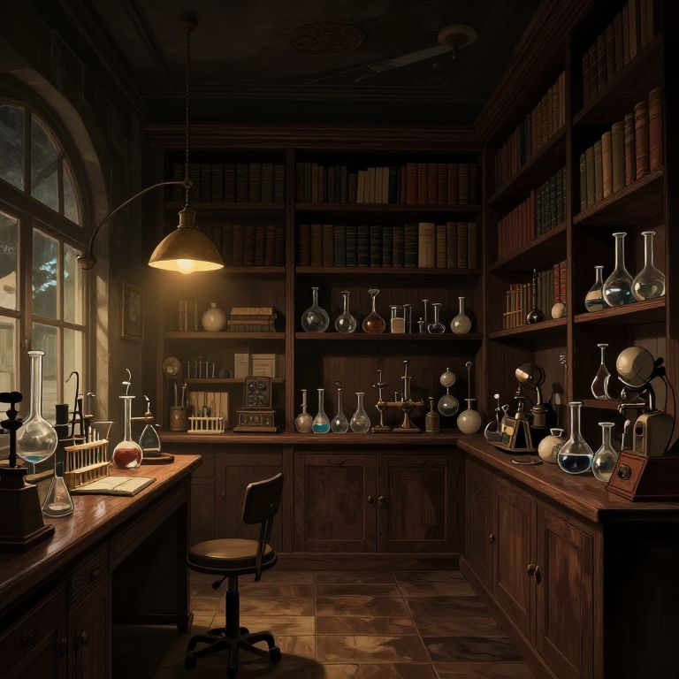 Photograph of a dimly lit, vintage-style laboratory with wooden shelves, glass beakers, and flasks, illuminated by a single hanging lamp.