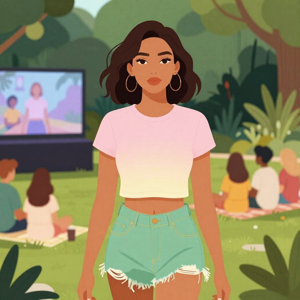 A stocky woman in casual street style, wearing a white crop top and a navy blue pleated mini skirt, black lace-up ankle boots, and minimal tattoos on her arm, with ombré hair, relaxing in a tropical garden with a hammock, illustrated in a Yen Press visual style. Sexy. Pretty face and beutiful eyes