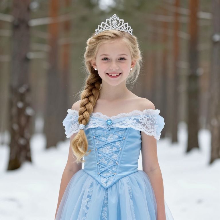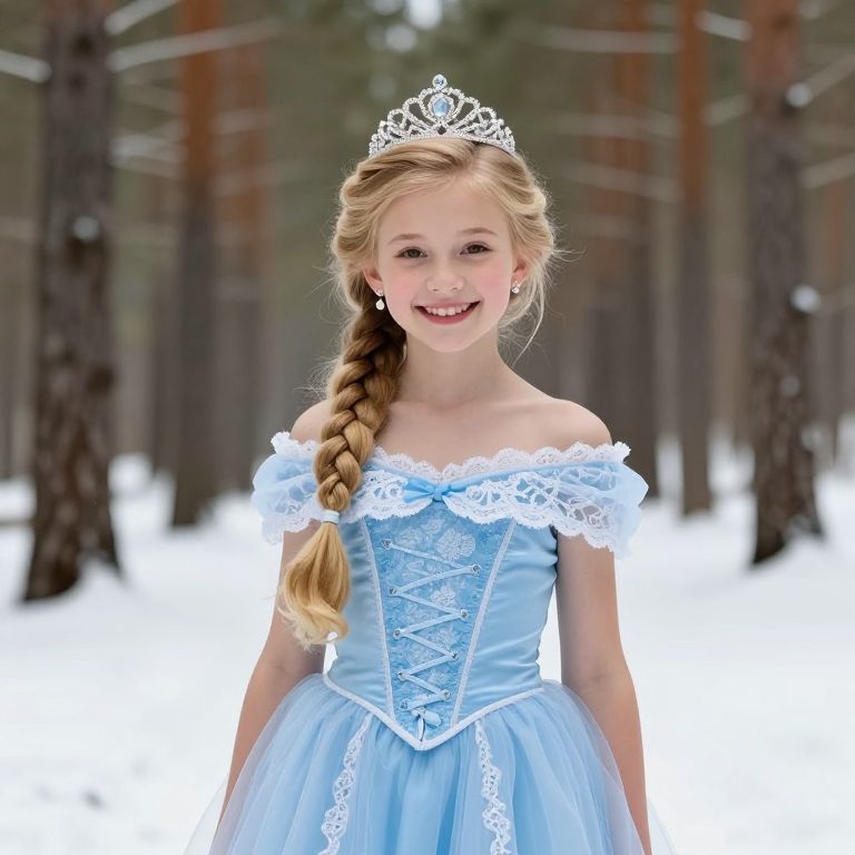 Photograph of a young, fair-skinned girl with long, braided blonde hair, wearing a sparkling silver tiara, an off-the-shoulder, light blue, lace-trimmed dress with a corset-style bodice, and white earrings. She stands in a snowy forest with tall, brown pine trees blurred in the background. She smiles brightly at the camera, exuding a princess-like charm.