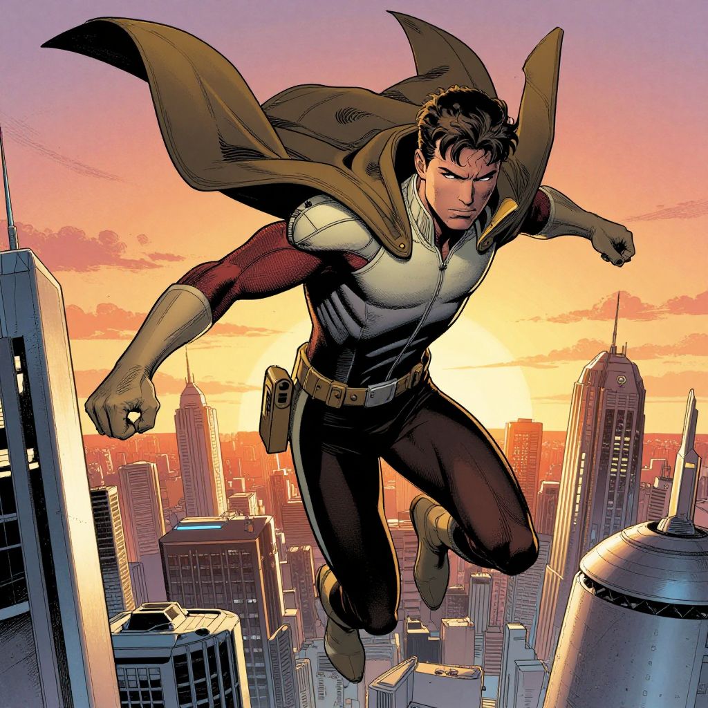 This digital comic-style illustration features a muscular, dark-haired man with a determined expression, leaping through a cityscape during a vibrant sunset. He wears a brown, billowing cape, a white, form-fitting shirt, red sleeves, and black pants with a utility belt. His fists are clenched, and he is mid-air between tall skyscrapers, with one building prominently in the foreground on the right. The sky is painted in warm hues of orange, pink, and purple, contrasting with the dark, sharp lines of the buildings. The art style is reminiscent of classic superhero comics, with bold outlines and dynamic action.