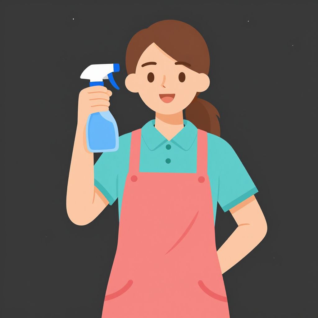 Digital illustration of a smiling woman with brown hair, wearing blue apron, yellow gloves, white shirt, holding spray bottle and mop.