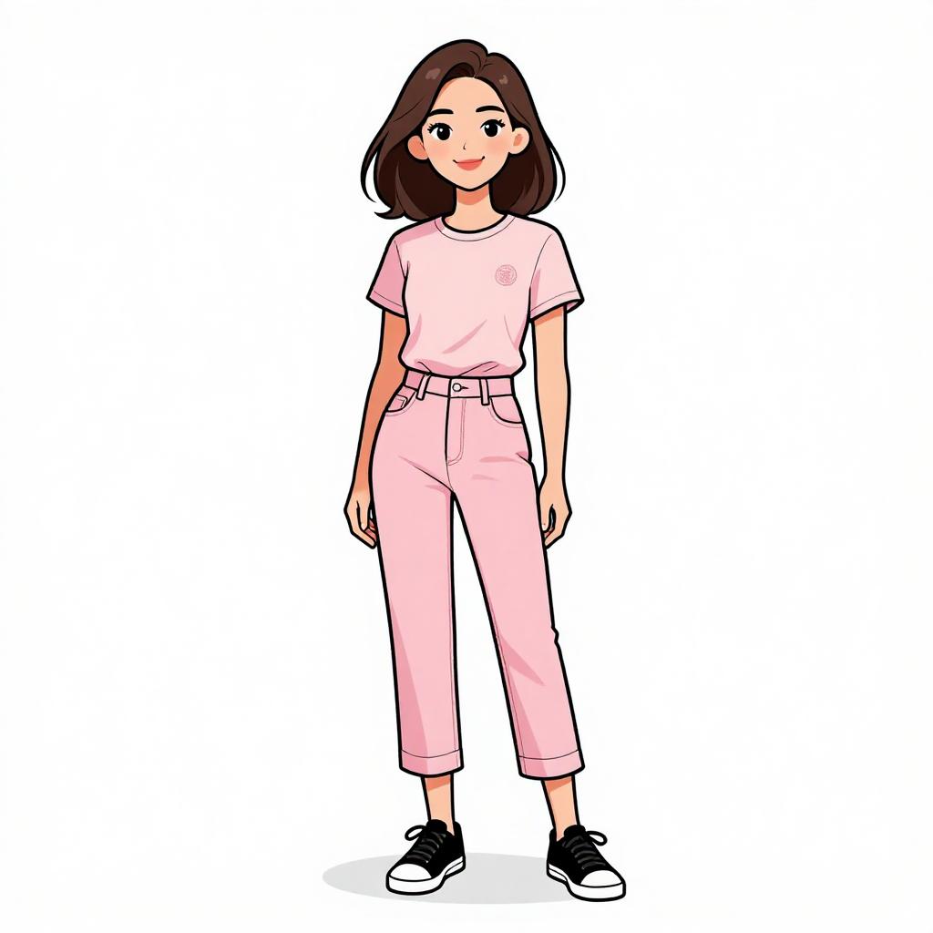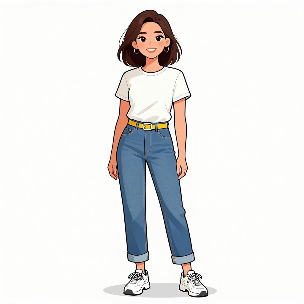 Woman with pretty face and pretty hair. smiling Woman, casual streetwear, cropped white t-shirt, blue denim overalls with side button detailing, cuffed at the ankles, classic white sneakers, ponytail with bangs, plain white studio background. --sref 1467
