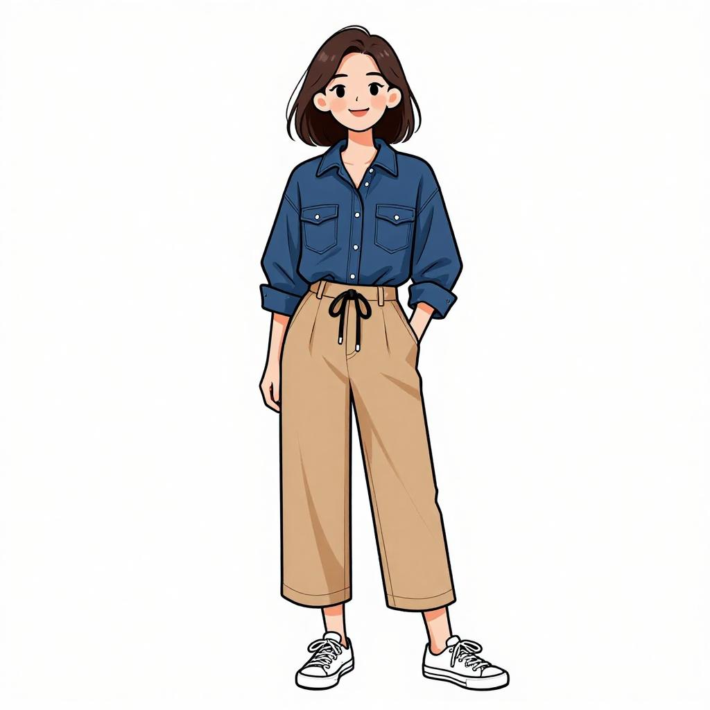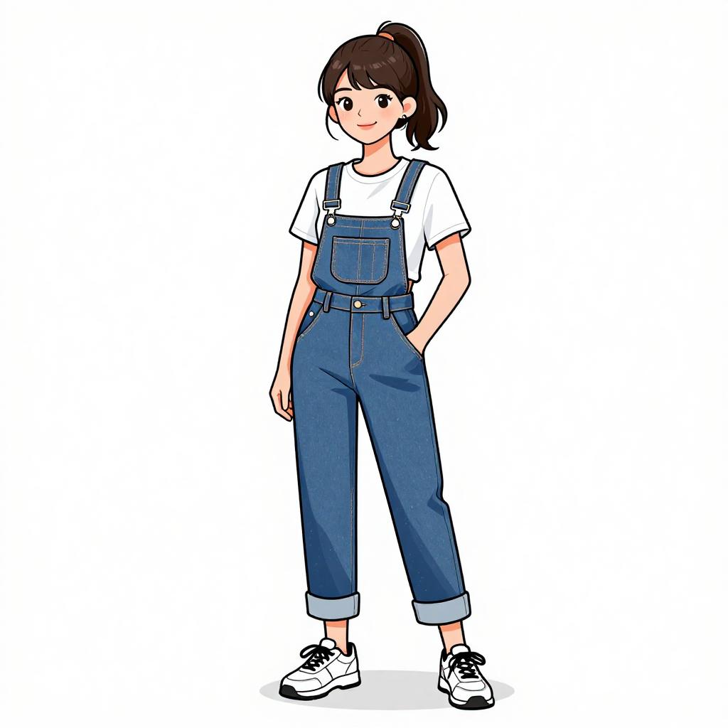 This digital anime-style drawing features a young woman with light skin, brown eyes, and brown hair tied in a high ponytail. She wears a white short-sleeved t-shirt under blue denim overalls with her hands in the front pockets, and her overalls are cuffed just above the ankles. She completes the outfit with black and white sneakers. The background is completely white, emphasizing the character. The drawing uses bold, clean lines and a limited color palette, typical of modern digital anime art. The overall style is cute and casual, reflecting a relaxed, everyday look.