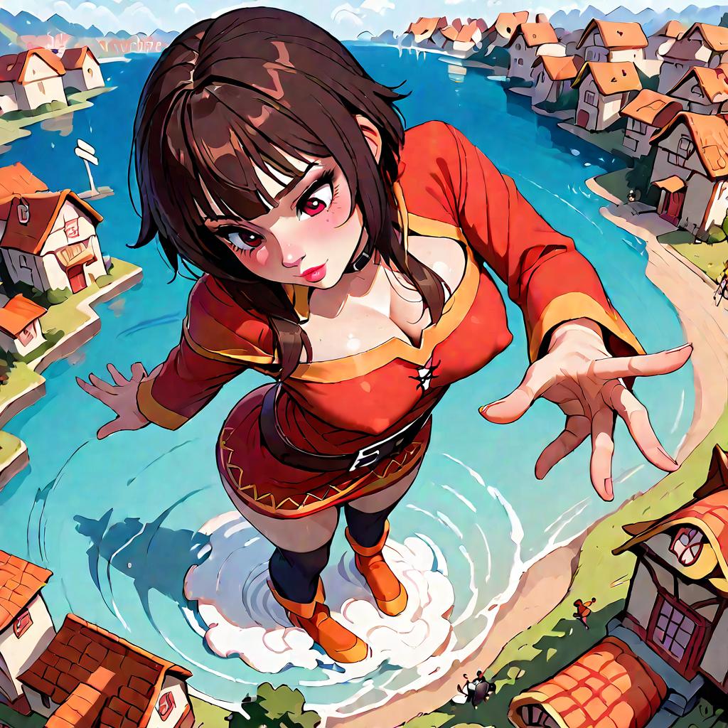 Score_9, score_8_up, score_7_up, score_6_up, score_5_up, score_4_up, 1girl, source_anime, person between breasts, between_breasts, size difference, large breasts, 1boy, megumin with tiny kazuma, tiny kazuma (breasts of megumin), kazuma, detailed, covered nipples, (view from above:1.2), open breasts, person squeezed inside breasts of giantess, giantess in village