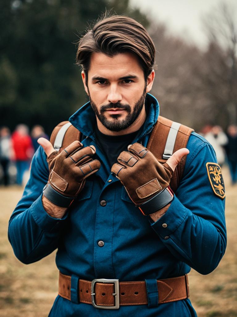 Theme costume guy, 1boy, male focus, solo, hat, outdoors, pants, full body, facial hair, looking at viewer, standing, blurry, belt, long sleeves, day, boots, jacket, blurry background, closed mouth
