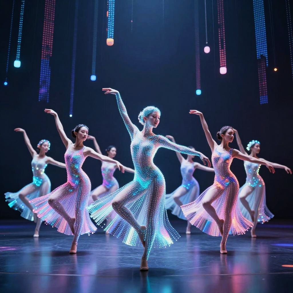 Photograph of a ballet performance: Dancers in sparkling white dresses with blue and pink LED lights, performing in unison on a dark stage with colorful