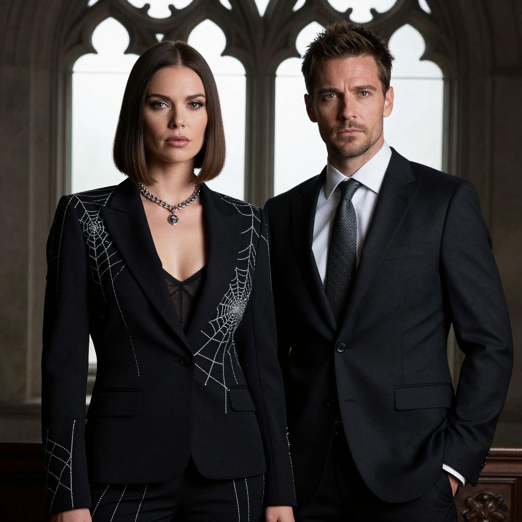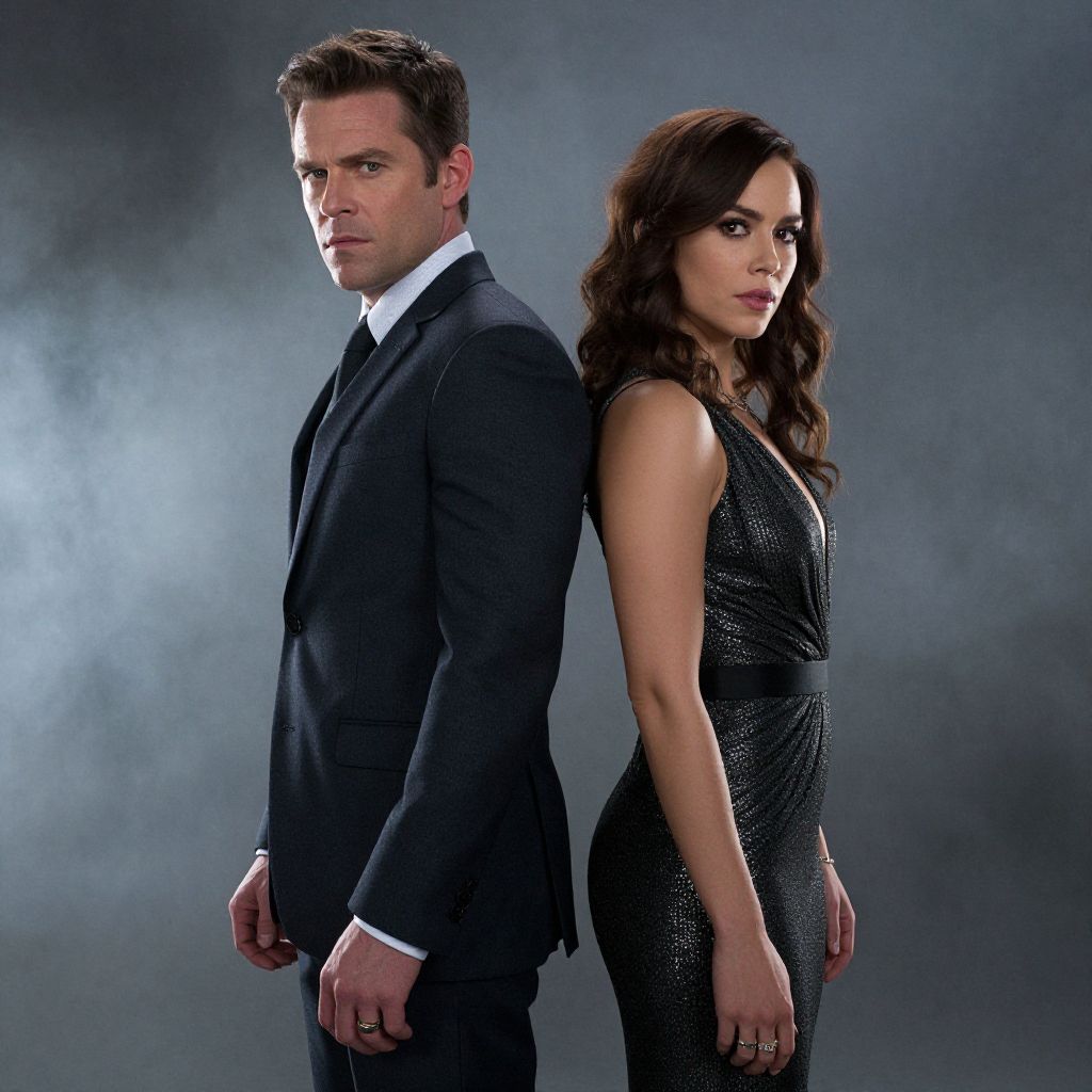 Two characters from *Legends of Tomorrow* stand side by side against a smoky backdrop, with the man dressed in a dark suit and the woman in a shimmering black dress, both exuding intensity as they face forward.
