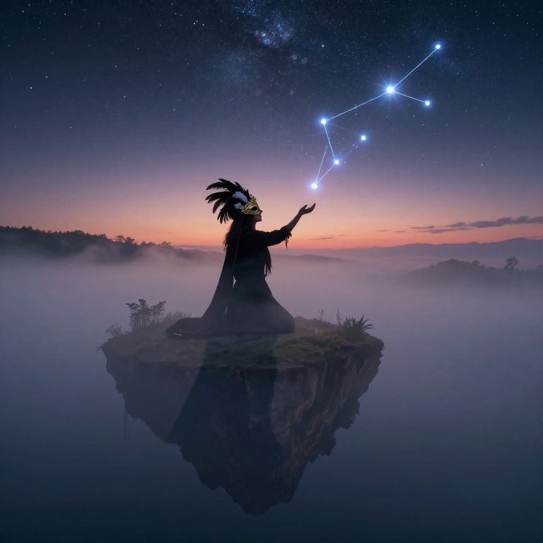 Silhouetted indigenous figure with feathered headdress on floating island, pointing at constellation in starry, twilight sky with misty horizon. Digital