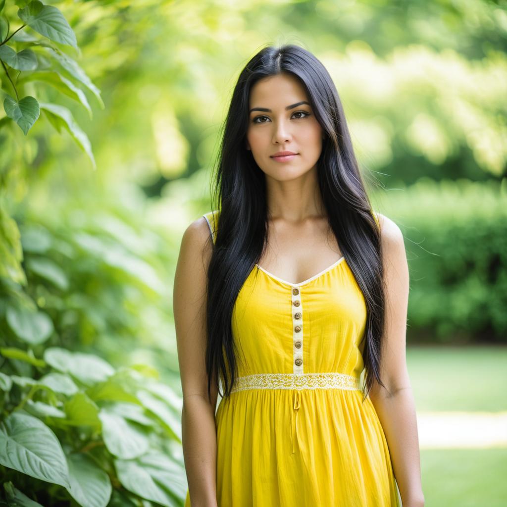 Portrait of a young woman with long black hair wearing a bright yellow sundress. She stands outdoors in front of a blurred green leafy background with soft natural lighting and shallow depth of field.