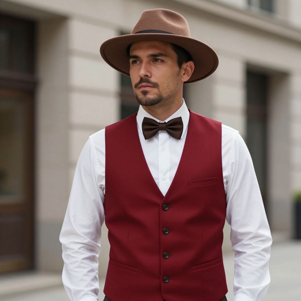 A man wearing a red vest with a white shirt and a brown bow tie, standing in front of a building, with a brown hat on his head. The man has a confident and stylish appearance, with a strong presence and a calm demeanor. His clothing is well-fitted and polished, reflecting his attention to detail and personal style. The setting is a urban environment, with the building in the background providing a sense of structure and purpose. The overall scene is composed with a focus on the man's attire and the architectural details of the building, creating a balanced and visually appealing image.