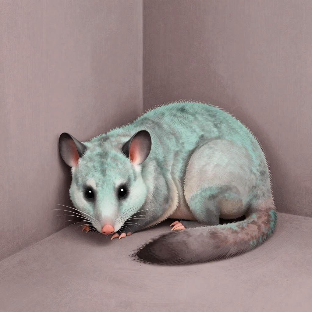 Illustration of a wistful possum, laying in the corner of a wall. Rendered in the style of dusty mauve and soft mint, influenced by Konstantinos Parthenis and Louis Majorelle, featuring surreal yet realistic textures and emotional depth.