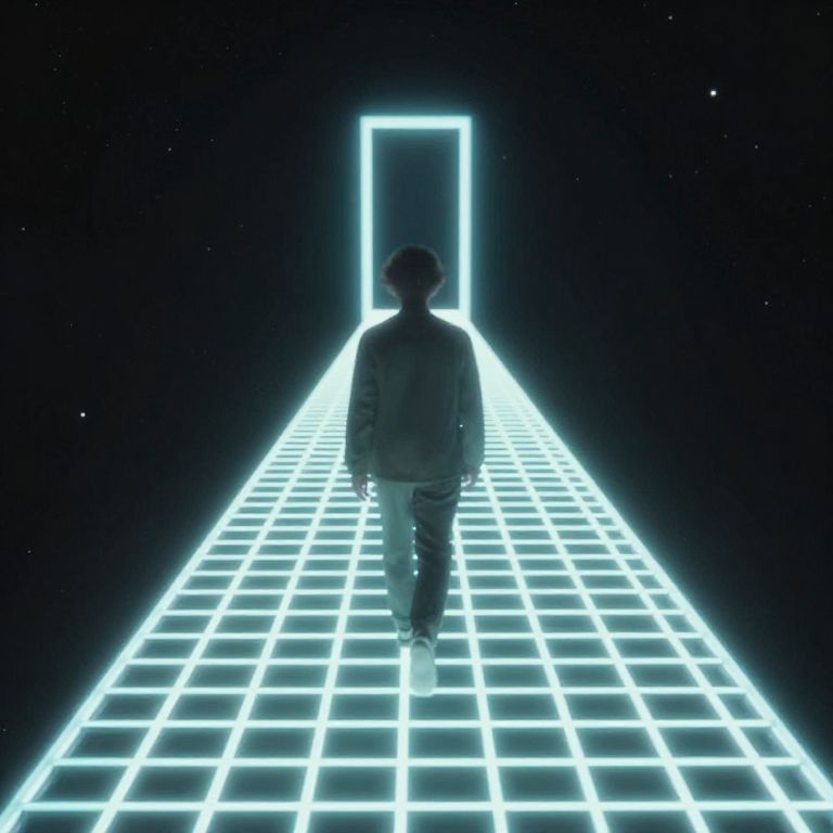 Image Processing a personal astral projecting and walking across a glowing grid like bridge suspended in space leading to a glowing doorway, in the style of the real theory,