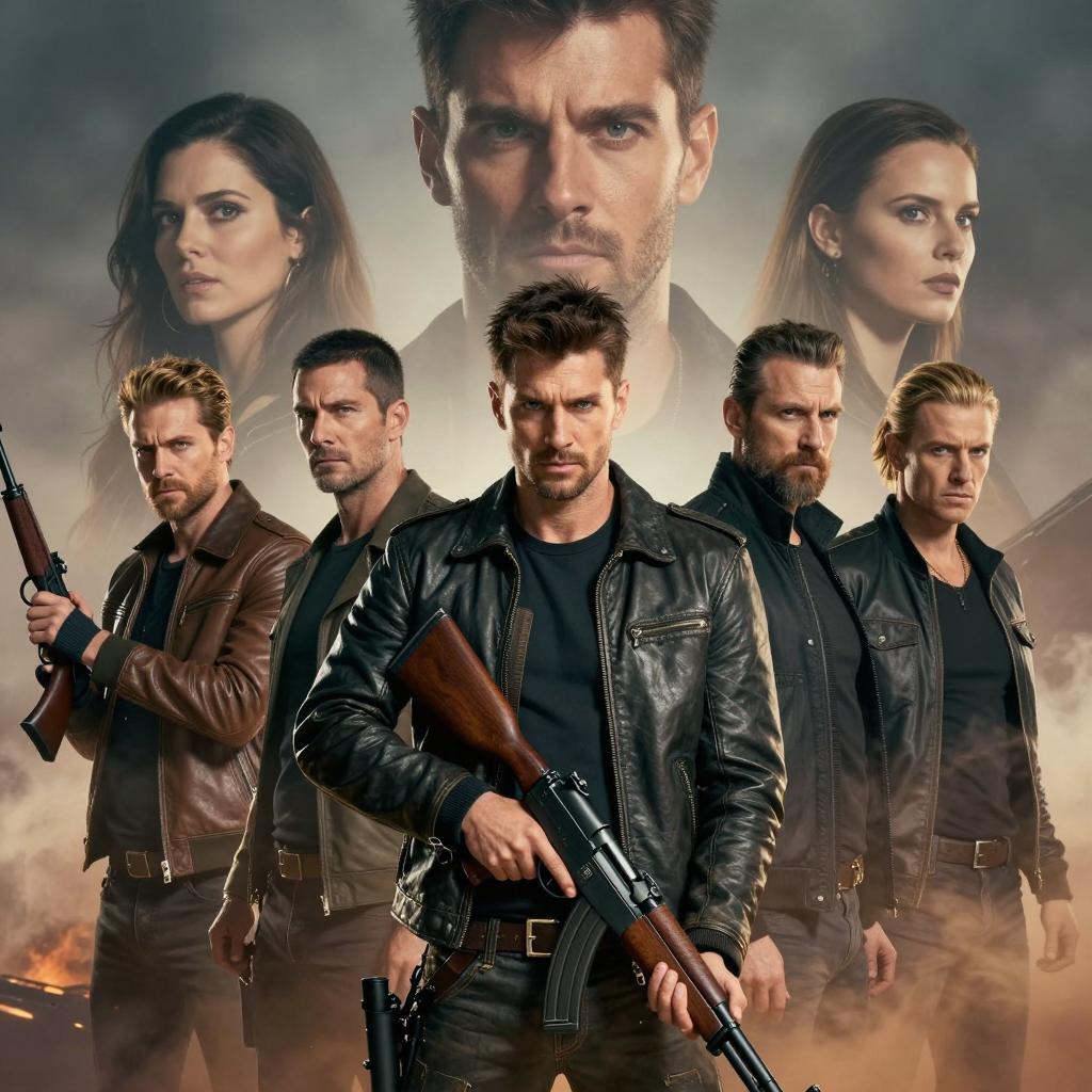 Photograph of a man and woman in a dark, smoky landscape. Man in the foreground, muscular, with short dark hair, serious expression, leather jacket, holding a gun over his shoulder. Woman in the background, blonde, intense expression, wearing a low-cut dress with feather details, holding a pistol. Group of people and animals in the distant background.