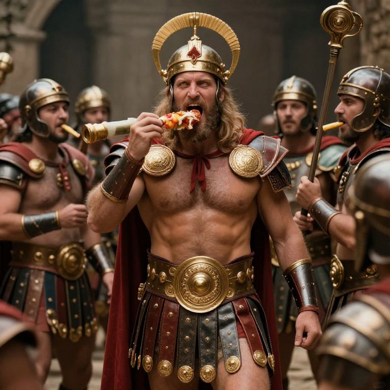 Tube Radio champion gladiator feasting, surounded by his servents, enjoying life, living like a king,