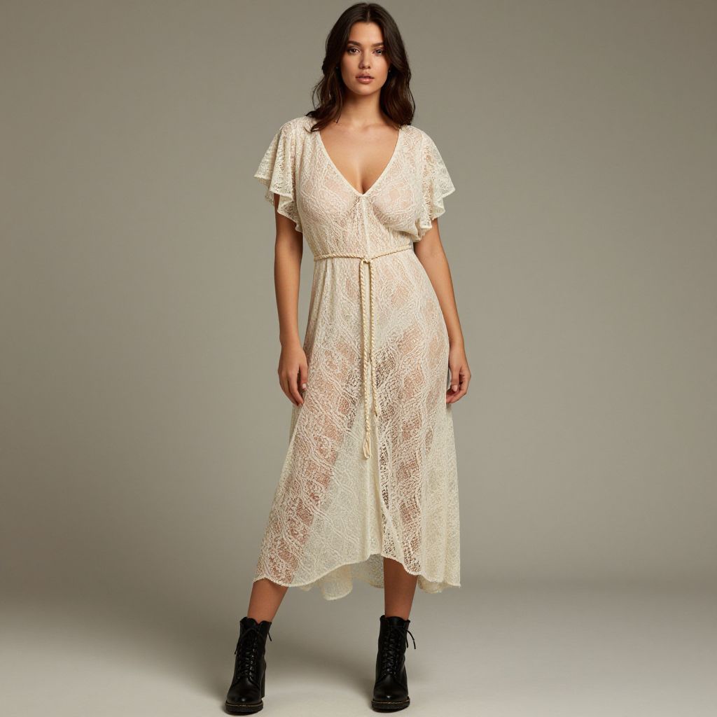 "Woman, bohemian chic, sheer off-white lace overlay dress, short flutter sleeves, V-neck, cinched at waist with braided tassel belt, midi-length with raw hem, black lace-up ankle boots, minimal jewelry, neutral studio background.. Sexy. Pretty face and beаutiful eyes. Big breasts."