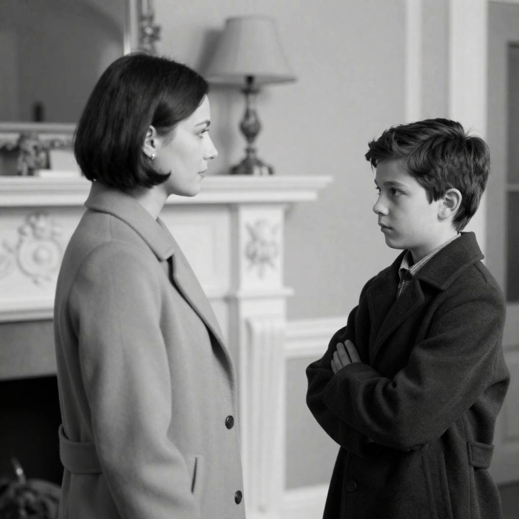 Black and white photo depicting a blonde boy wearing a dark vest and light shirt standing in front, with an intense expression. To his right stands a man in a trench coat, also looking serious. Behind them is a woman in a white dress with a contemplative expression. An open car door is visible in the background along with blurred trees and a distant figure, creating a dramatic and emotional atmosphere.