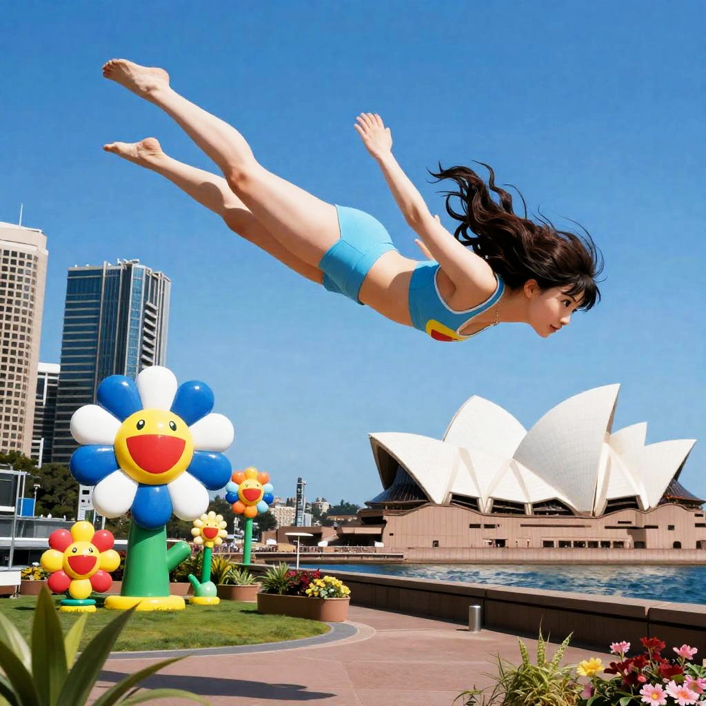 Realistic photo.Takashi Murakami full colours, Pop Art, strange, bizarre, fantastical, fantasy, Sci-fi, Japanese anime, urban rooftop garden in a futuristic city, Sydney Opera House, the beautiful girl in a miniskirt diving freely, perfect voluminous body, detailed masterpiece low high angles perspectives realistic photo