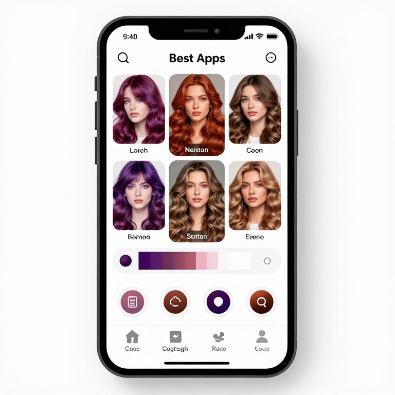 Best apps to change hair color showcased on a smartphone screen, vibrant hair transformations in diverse styles and shades, user interface with easy color selection tools, sleek modern app design, bright lighting, realistic digital art style.