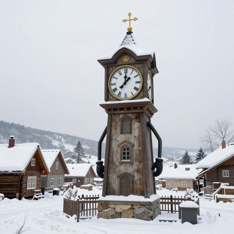 Sentient Clock Tower in Snowy Village