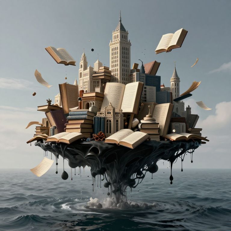 Digital artwork of a floating, book-filled cityscape with open books and papers flying, emerging from ocean water, under a clear sky.