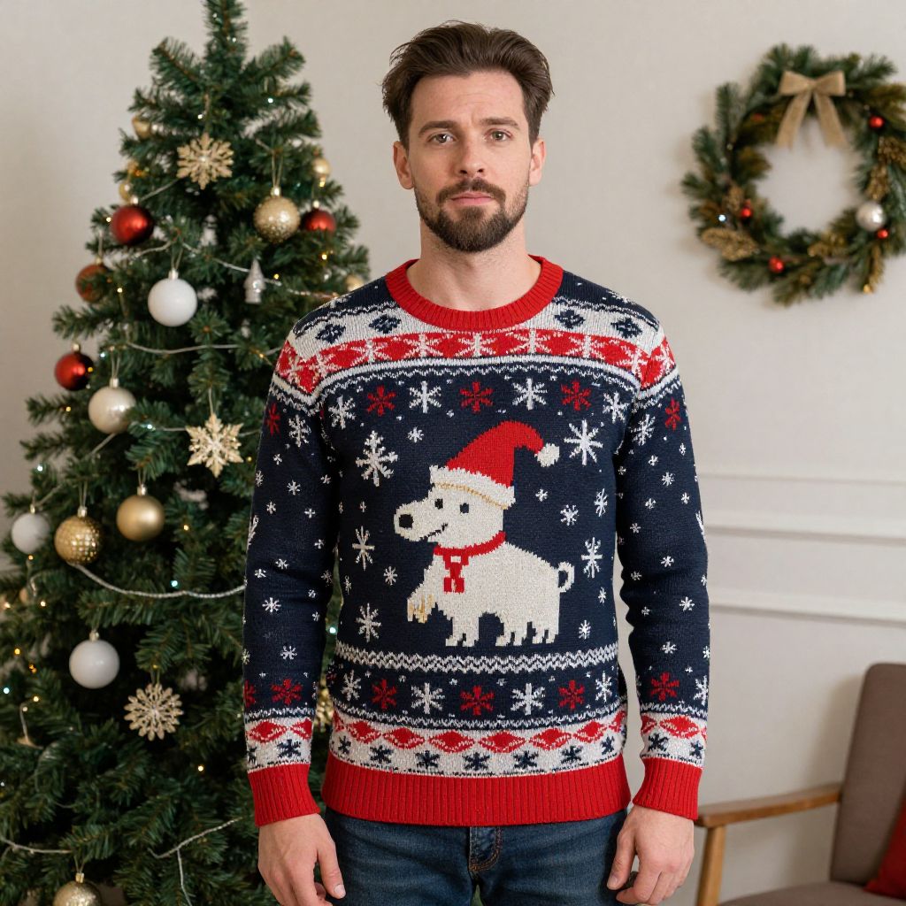 Retro Christmas Jumper Costume, man in a christmas sweater standing in front of a christmas tree
