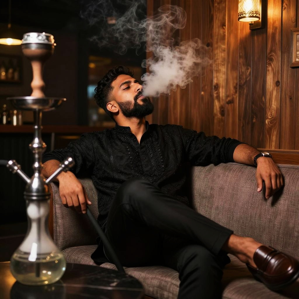 Man smoking shisha, adult man lounging in a stylish hookah bar, South Asian man with medium-brown skin, neatly trimmed full beard, short textured hair and a subtle scar on his right eyebrow wearing embroidered black kurta with slim black trousers and polished leather loafers, leaning back against a sofa with head tilted upward, exhaling a long plume of smoke toward the ceiling, tall dark glass hookah standing on the table beside him, warm cosy lighting with wooden wall panels in the background, moody nightlife atmosphere, realistic photography, high resolution