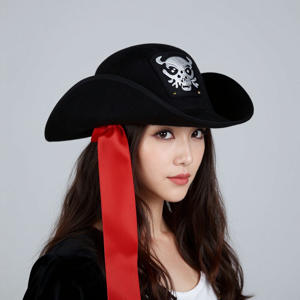 Photograph of an Asian woman with long dark hair, wearing a black pirate hat with a white skull emblem and red ribbon, against a light blue background