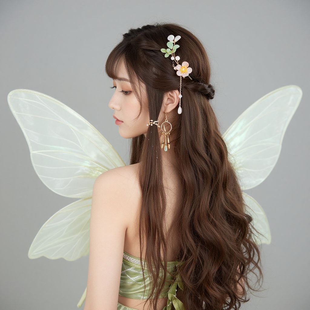 Woman costume fairy, 1girl, wings, solo, pointy ears, dress, flower, fairy wings, full body, hair flower, long hair, long sleeves, hair ornament, breasts, standing, fairy, black hair, puffy sleeves, medium breasts
