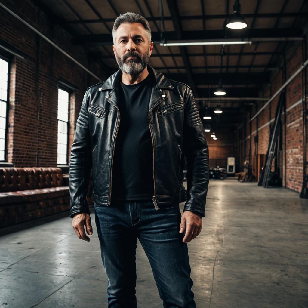 Professional photography of a middle-aged man with a beard, wearing leather jacket and dark jeans, set in an industrial loft with exposed brick walls. Captured with hyperrealistic details using Sony A9 II, cinematic lighting, panoramic volumetric effects, and naturalistic focus, resulting in a highly realistic and compelling composition.