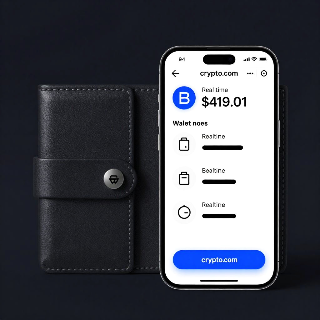 Crypto.com wallet screenshot highlighting real-time wallet balance updates and transaction alerts, minimalistic yet futuristic design, dark mode theme with neon highlights, immersive visual experience representing digital assets
