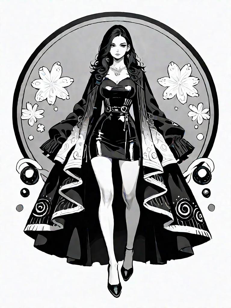 1girl, source_comics, realistic face, full body shot, Woman, glamorous, bodycon mini dress with a monochrome zigzag pattern, long sleeves, scoop neckline, fitted silhouette, statement silver necklace with oversized gemstones.