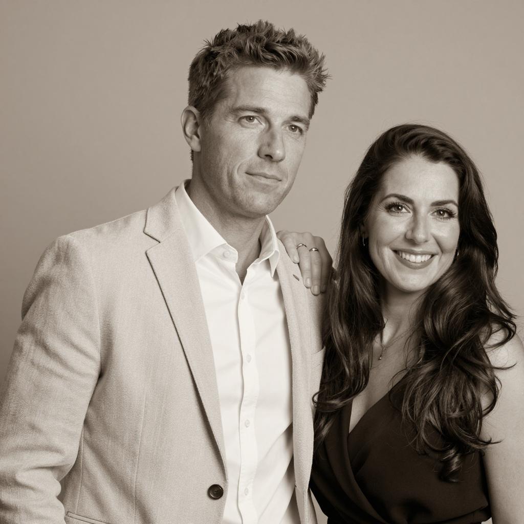 Sepia-toned photograph of two people. Man in light beige blazer and white shirt, short brown hair, slightly leaning to the right, looking forward. Woman with long dark hair, smiling, standing to his right. Background is plain sepia. Both subjects in upper body shot. Woman's arm rests on man's shoulder.