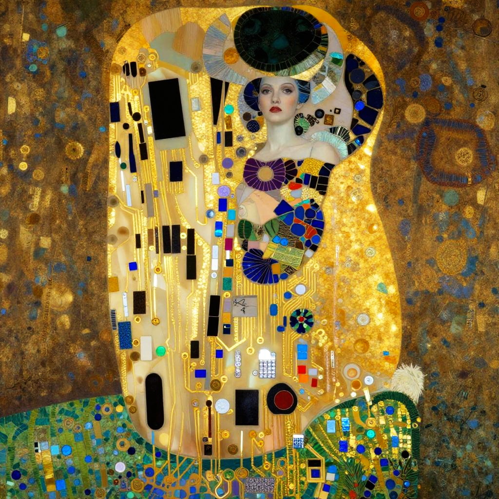 Inspired by the works of Gustav Klimt, a android courtesan adorned with gold-leaf circuitry and opulent mosaic swirls, illustrating the seamless connection between nature and technology in a captivating art nouveau style.