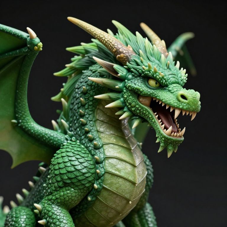 A green dragon with sharp teeth and a spiky mane, set against a dark background.
