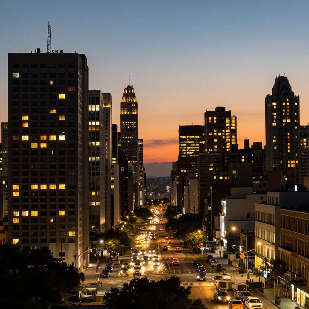 This photograph captures a vibrant nighttime cityscape of a densely built urban area. The image showcases a winding road in the lower center, illuminated by bright, neon-blue light trails from moving vehicles, creating a dynamic, flowing effect. Surrounding the road are tall, modern buildings with numerous lit windows, contributing to a mosaic of yellow, white, and blue lights. The buildings are predominantly rectangular with some featuring glass facades. In the background, the skyline is dotted with high-rise structures, their lights glowing against the dark, clear night sky. Palm trees are visible along the road, adding a touch of greenery to the urban scene. The overall composition highlights the contrast between the artificial lights and the dark night.