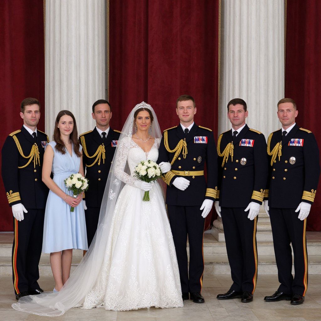 Formal portrait depicting a royal wedding scene featuring a bride in an elegant white gown with a long veil and tiara, accompanied by a groom in a navy military uniform with gold accents, flanked by four men in similar attire and a young woman in a light dress holding a bouquet, set against a backdrop of classical columns and a red drapery.