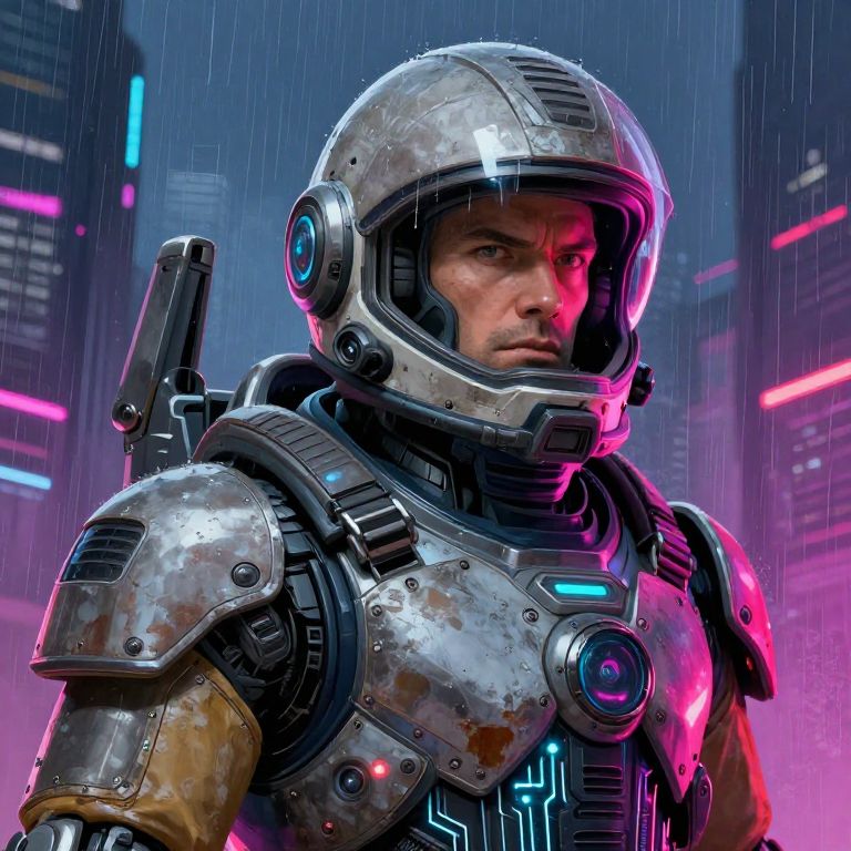 Digital art of a rugged, armored man in a futuristic rain-soaked city, glowing neon lights, cybernetic helmet, intense gaze, wet metallic