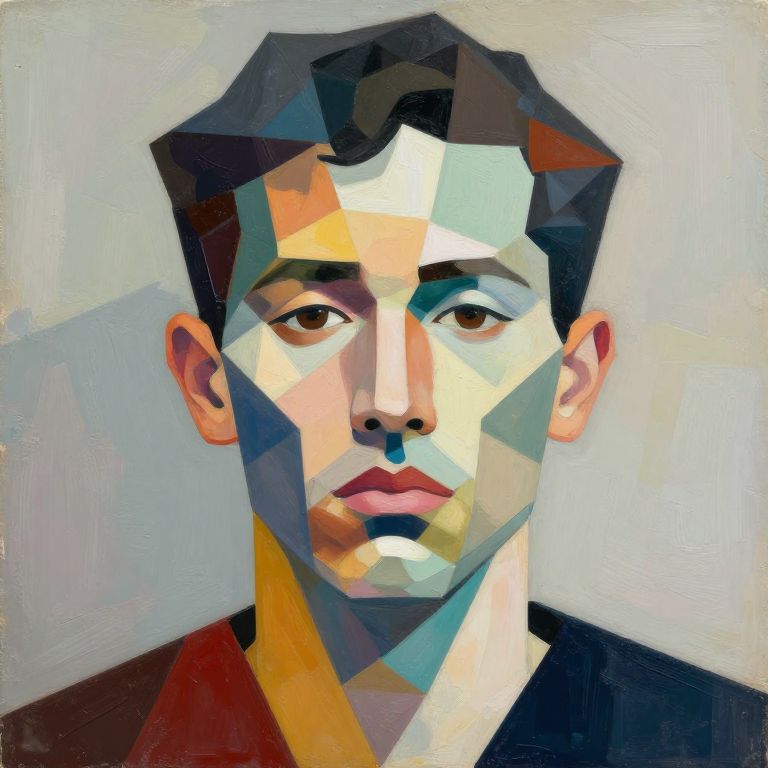 Turn photos into abstract art featuring fragmented geometric shapes and bold color palettes, transforming a simple portrait into a mosaic of interlocking planes and textured layers, creating a modern, avant-garde visual effect.