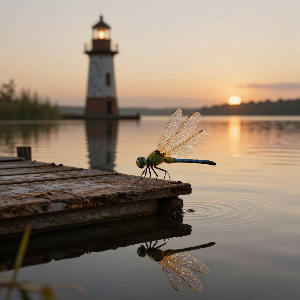 An enchanting digital artwork depicting an elegant dragonfly with glistening wings resting on a rustic wooden dock, its mirrored image dancing on the glassy surface of a calm lake. The backdrop showcases an ancient, deserted lighthouse basking in the golden hues of dusk, its light extending elongated silhouettes across the placid waters. This captivating scene seamlessly merges realism and fantasy, evoking a sense of serene beauty and the mysterious charm of neglected places, inviting contemplation and wonder within the observer.