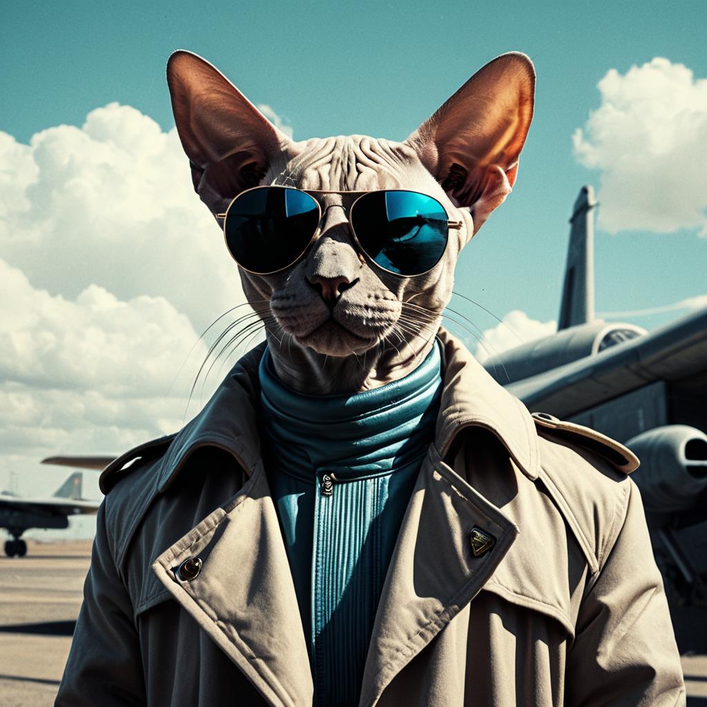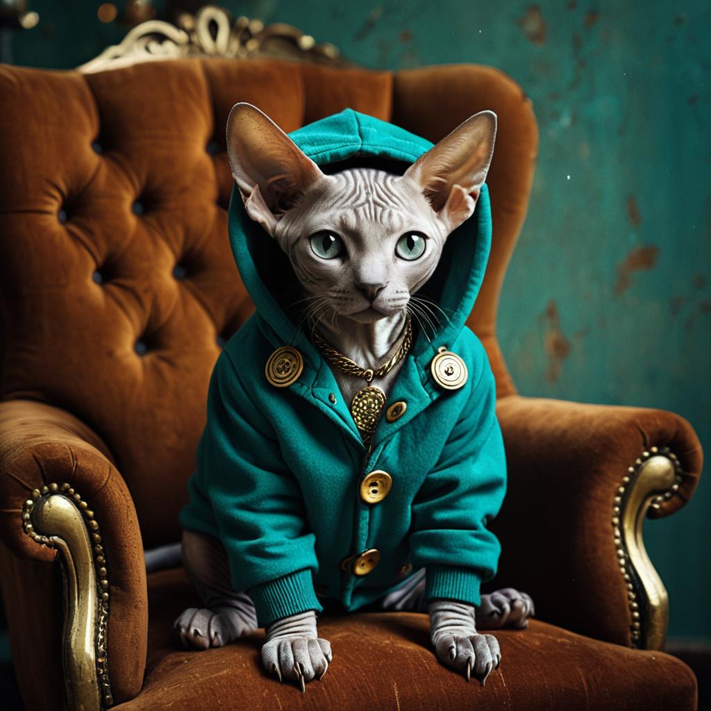 Sphynx Cat in Teal Hooded Jacket Sitting on Vintage Armchair